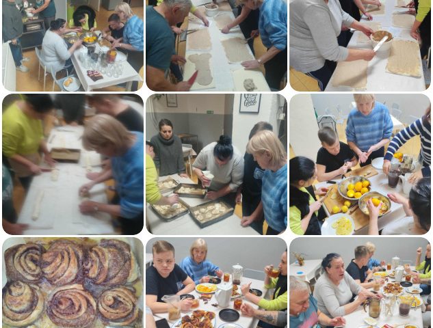 Uczestnicy spotkania zostali zaznajomieni z zasadą przygotowania ciastek z ciasta francuskiego i masy maślano-cynamonowej. Każdy zajął się swoją porcją ciastek – na płat francuskiego ciasta trzeba było rozsmarować masę, następnie zwinąć jak roladę, pokroić w mniejsze kawałki. Umieszczone na blachach ciastka zostały zalane śmietaną i powędrowały do piekarnika. W oczekiwaniu na upieczone cynamonki, przygotowana została jesienna rozgrzewająca herbatka z pomarańczą, cytryną, imbirem posłodzona cukrem trzcinowym. Zapach ciastek szybko rozprzestrzenił się po placówce, wszyscy z niecierpliwością wyczekiwali. A gdy już cynamonki zagościły na stole, uczestnicy zajęć z zachwytem stwierdzili, że są pyszne! To było radosne, spokojne, pełne rozmów spotkanie, podróż do świata smaków i zapachów.