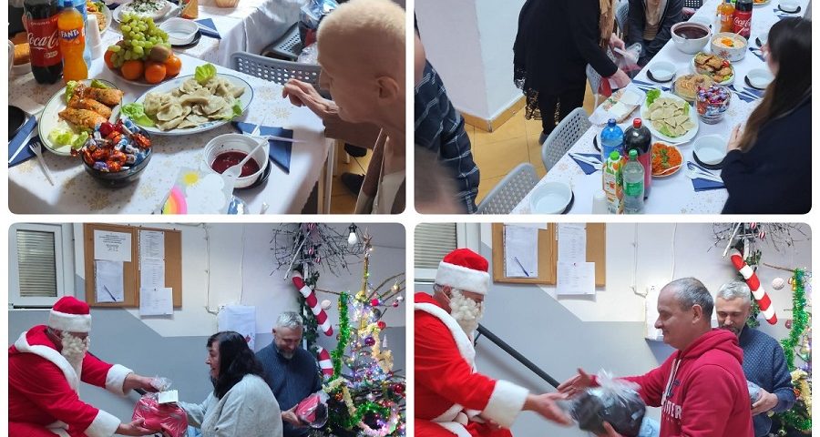 Tegoroczne Święta Bożego Narodzenia już za nami, poprzedzone były przygotowywaniami – mieszkańcy wykonali generalne porządki, w kuchni zaplanowano i przygotowano świąteczne posiłki, duże zaangażowanie włożyli mieszkańcy Schroniska w przygotowanie świątecznych ozdób ustrojenie świąteczne pokoi i innych pomieszczeń, wszędzie zapanował ciepły świąteczny klimat. Gdy nadszedł Dzień Wigilii, wszyscy obecni w placówce spotkali się przy wigilijnym stole, były życzenia, no i oczywiście odwiedziny Mikołaja.
